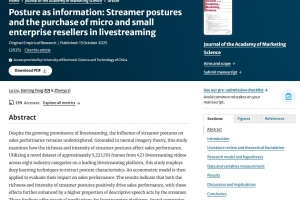 近期,电子科技大学经济与管理学院教师方佳明教授在国际A类期刊Journal of the Academy of Marketing Science在线刊发了研究成果“Posture as Information: Streamer Postures and the Purchase of Micro and Small E...