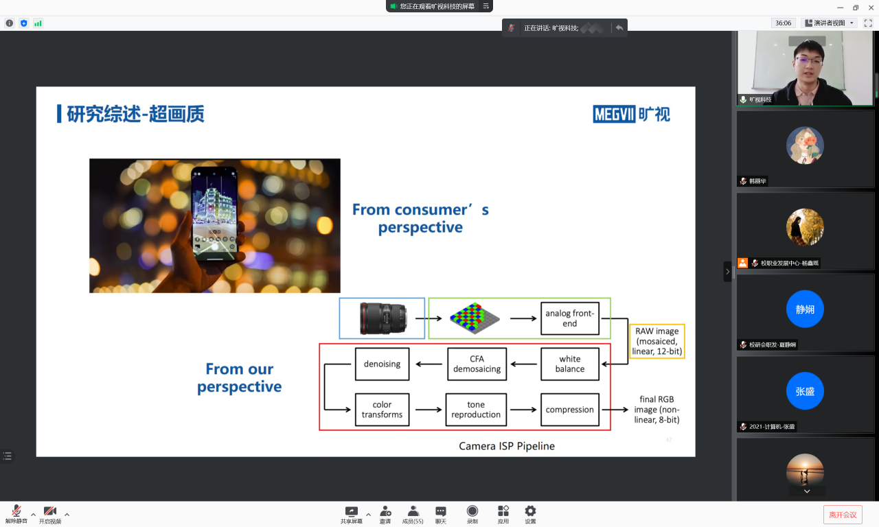 活动伊始,同学们通过企业宣传片感受了工作环境与文化氛围,正式开启了云游旷视之旅。旷视科技的嘉宾分享了对人工智能行业发展的见解,以及物联网技术在消费、城市、供应链领域广阔的应用前景,并结合我校研究生的学科特色,就高动态范围成像原理等图像处理领域的前沿技术进行了详细讲解,开拓了同学们的技术思维与就业视野。