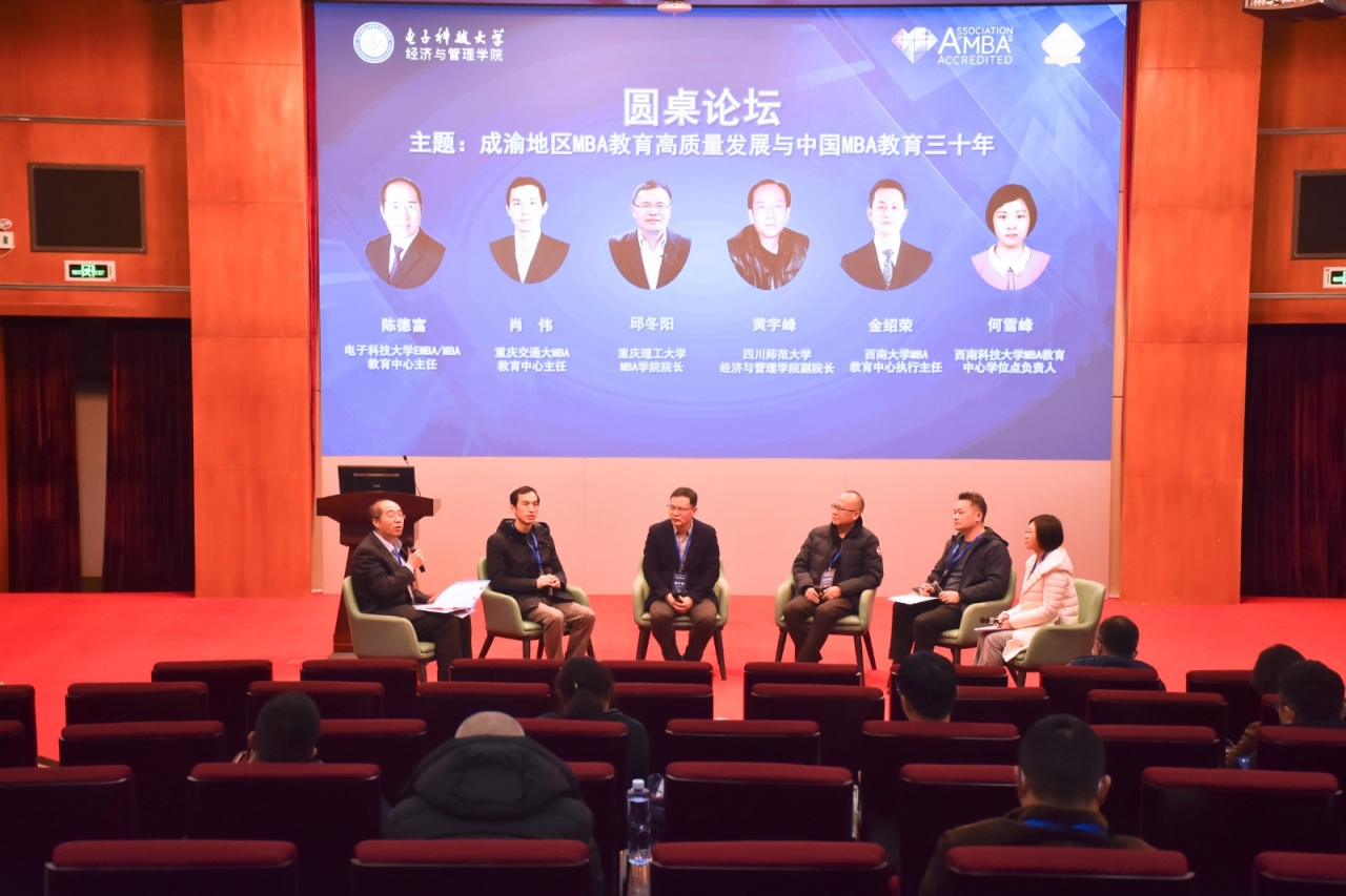 在圆桌论坛环节中,重庆交通大学MBA教育中心主任肖伟教授、重庆理工大学MBA学院院长邱冬阳教授、四川师范大学经济与管理学院副院长黄宇峰教授、西南大学MBA教育中心执行主任金绍荣副教授、西南科技大学MBA教育中心学位点负责人何雪峰副教授参与讨论。各位嘉宾从成渝地区、MBA教育和高质量发展三个关键词为切入点,分别介绍了所在学校的MBA教育情况和一些思考等。