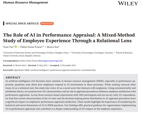 近日,经济与管理学院潘源博士在国际期刊Human Resource Management在线发表研究成果“The Role of AI in Performance Appraisal: A Mixed-Method Study of Employee Experience Through a Relational Lens”。该论文由潘源博士、德国哥廷根大学Fabian Froese教授和哥廷根大学博士生薛杉子合作撰写,潘源博士为第一作者,电子科技大学经济与管理学院为第一作者单位。